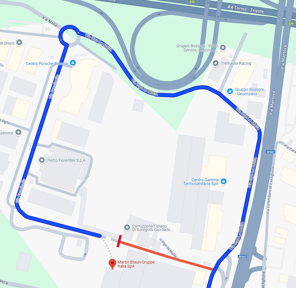 N.B. Un tratto di Via Ugo La Malfa è chiuso (parte evidenziata in rosso nell'immagine). Per raggiungere Martin Braun-Gruppe Italia S.p.A. percorrete l'altro tratto di Via Ugo La Malfa, fino a raggiungere la rotonda ed imboccare Via Faustinella (percorso in blu nell'immagine).