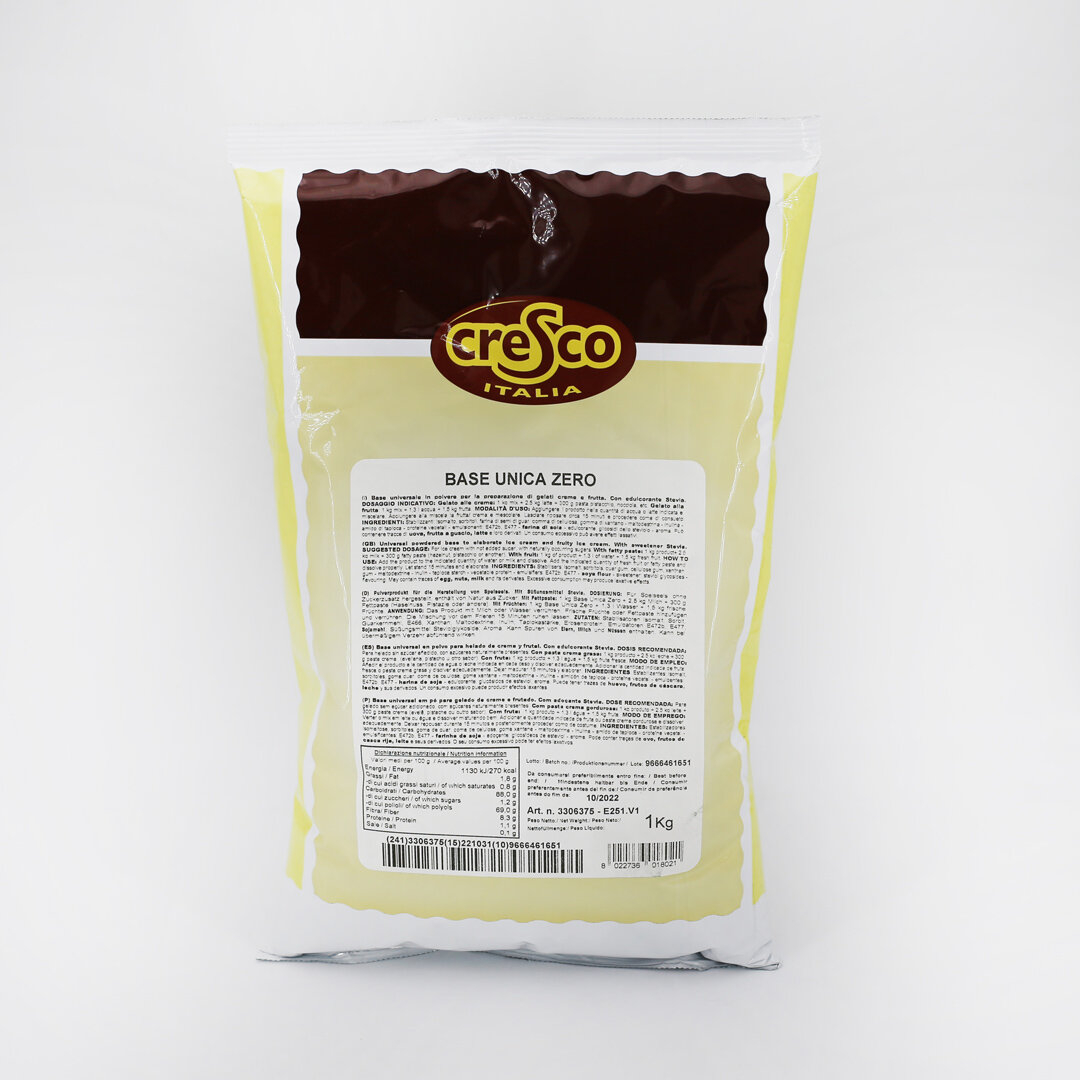 Preparato in polvere per base gelato creme e frutta senza zucchero. Con Stevia. Lavorazione a freddo con acqua o latte.
