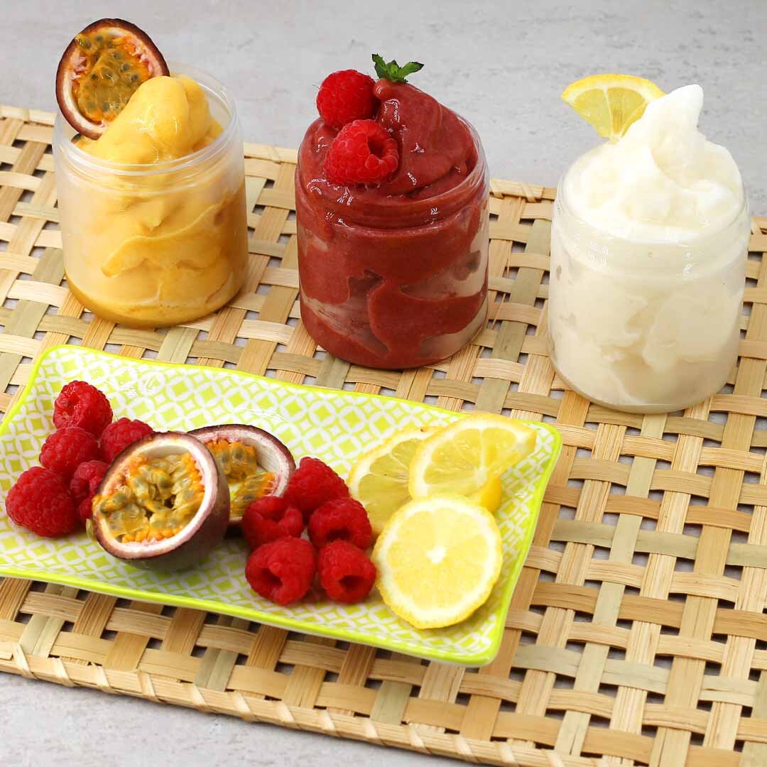 Base per un gelato senza grassi e derivanti del latte, tipo sorbetto, per un gelato molto cremoso, stabile in vetrina