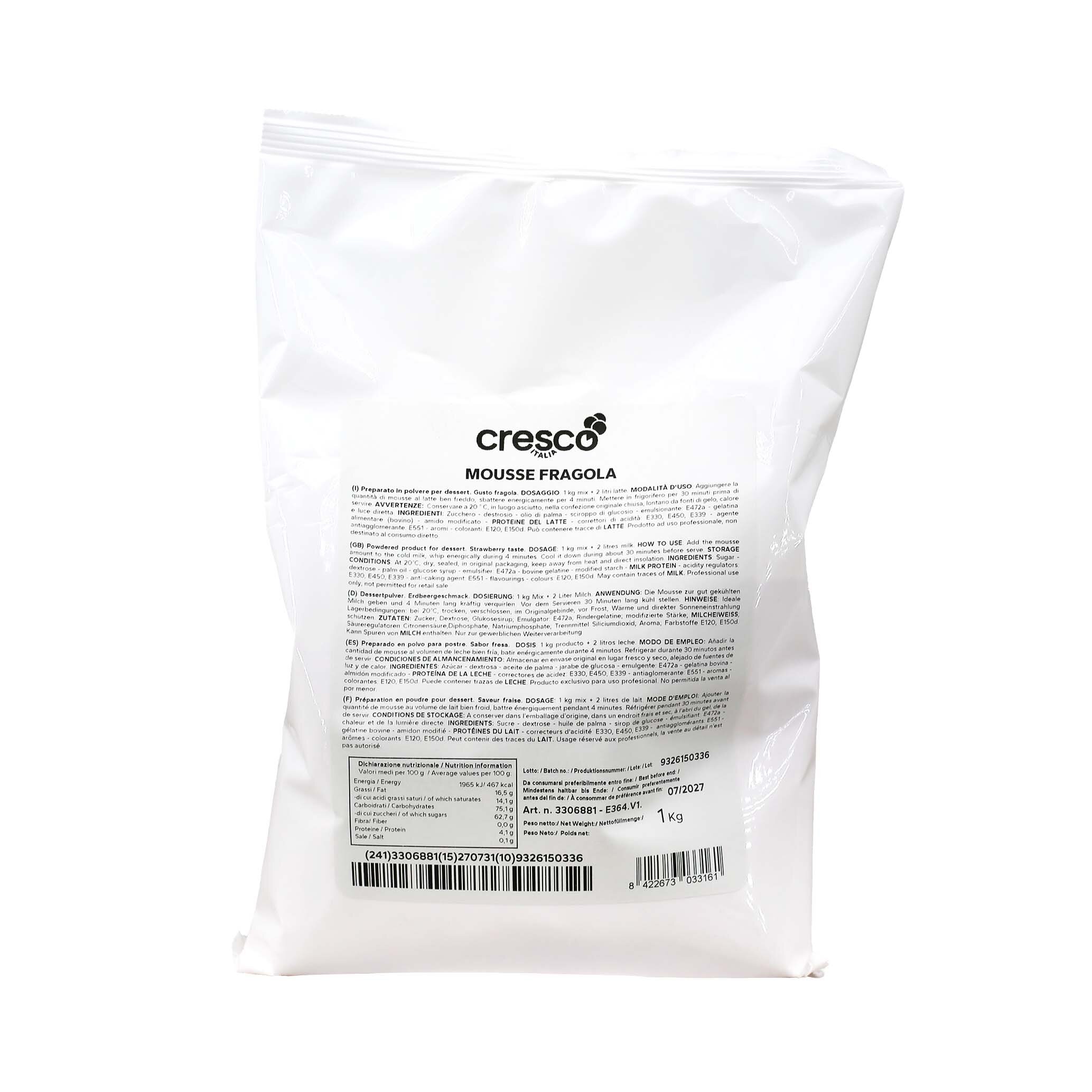 Preparato in polvere per dessert, gusto fragola. In pasticceria e nella ristorazione collettiva per la preparazione di mousse, guarnizioni, dessert, piccola pasticceria e monoporzioni