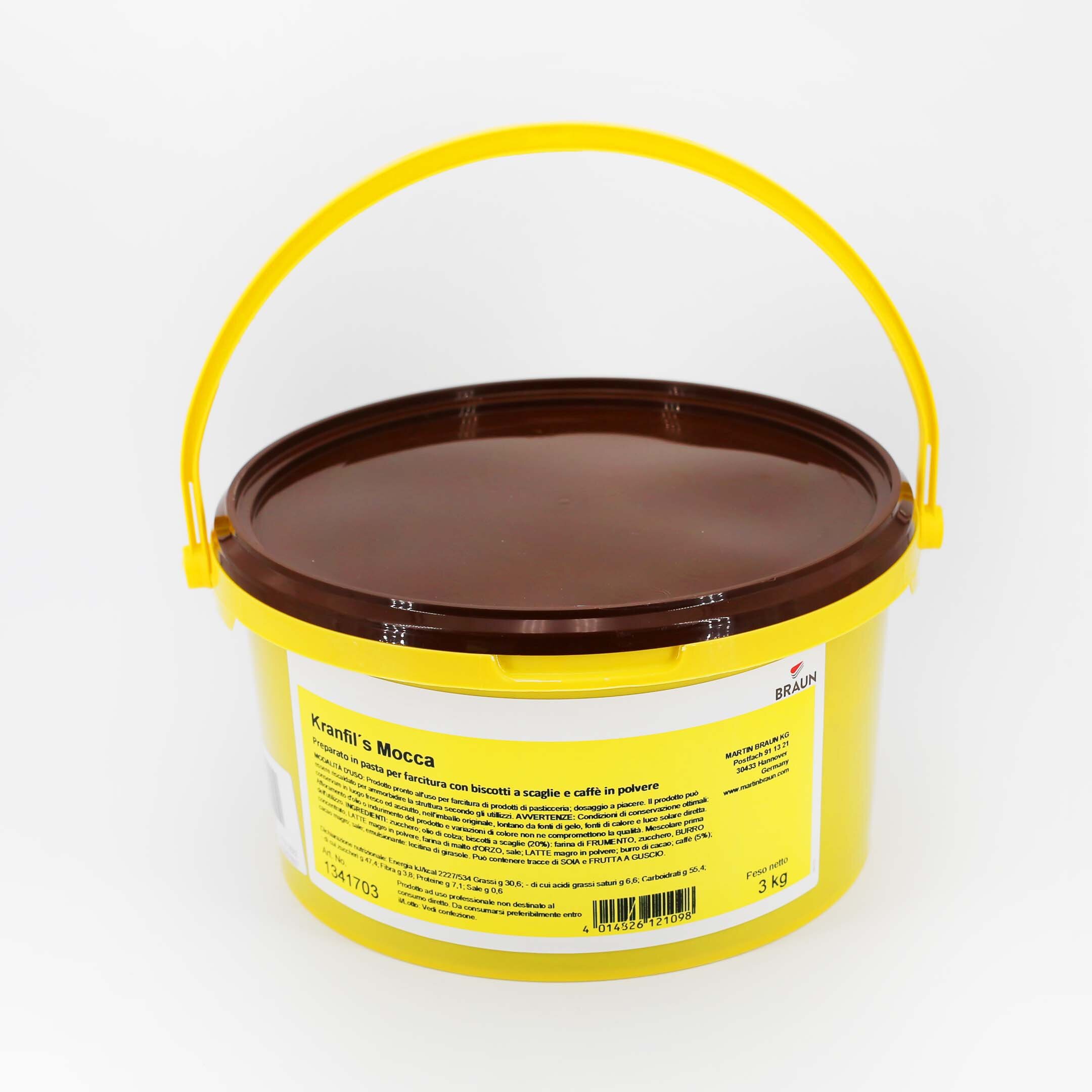 Preparato in pasta per farcitura con biscotti a scaglie e caffè in polvere. Ideale per aggiungere una nota croccante a tutti i dessert (torte, semifreddi, cheesecake, mousse, crostatine, monoporzioni ecc.). Per farcire macarons, lollipop, truffles, praline, ecc.
