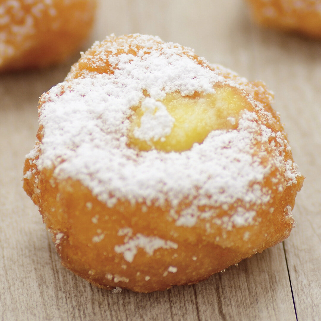 Impastare in planetaria tutti gli ingredienti con frusta a farfalla per 2 minuti a media velocità. Lasciare riposare l’impasto per 20 minuti. Colare e friggere a 170-180°C per 7 minuti. Farcire a piacere.