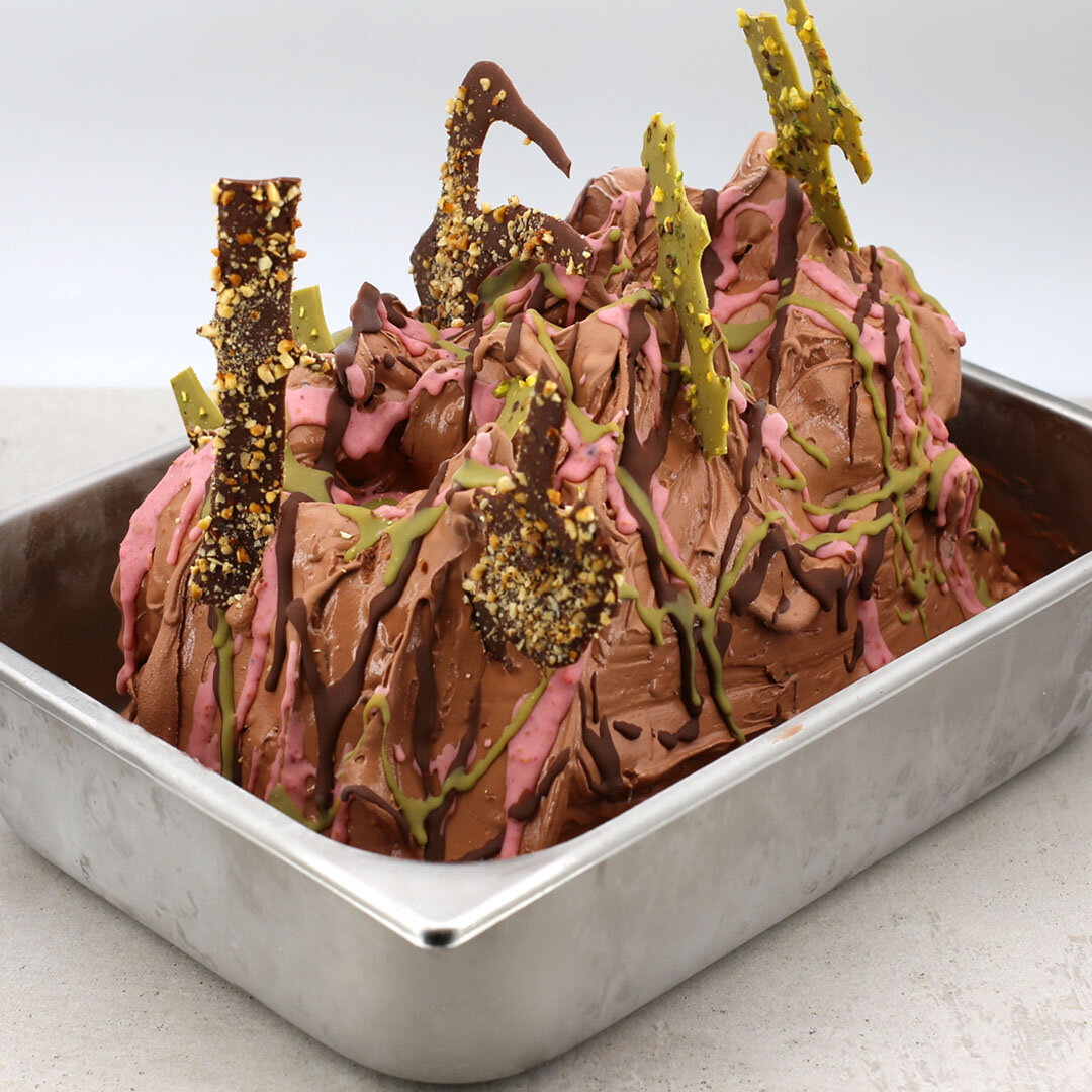 In estrazione variegare a piacere e decorare con pezzi di snack cioccolato e arachide.