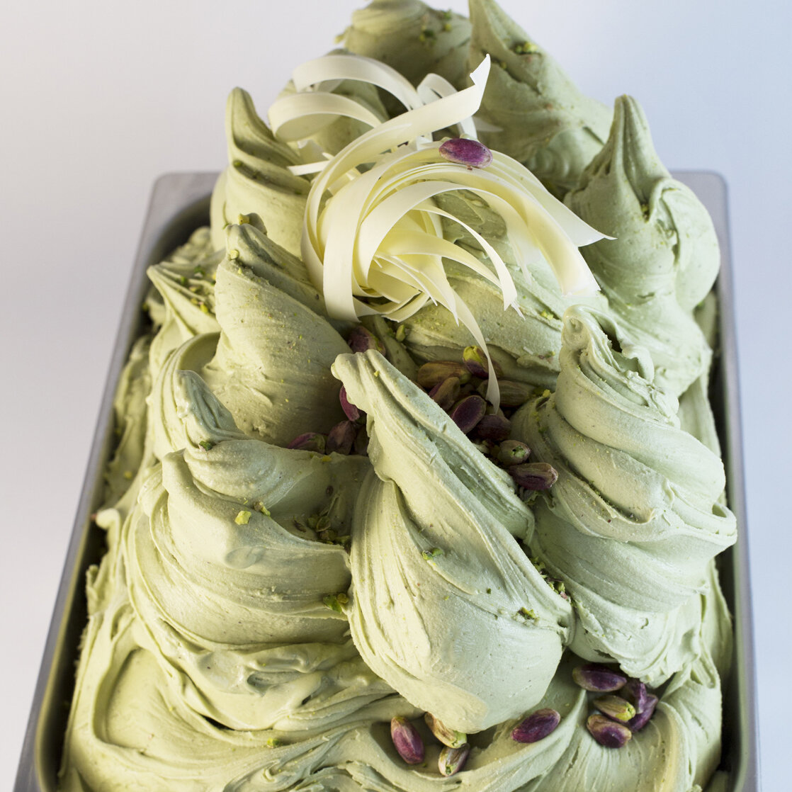 Sformare il semifreddo e glassare con Variegò. Decorare con granella di pistacchio e abbattere.